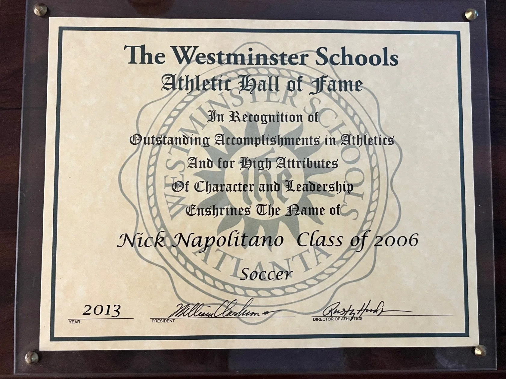 Nick was inducted into the Westminster Hall of Fame, and his soccer jersey was retired, a special honor, in May 2012. His number, 2, appears on all soccer team jerseys and only the captain of each year’s team wears No. 2.